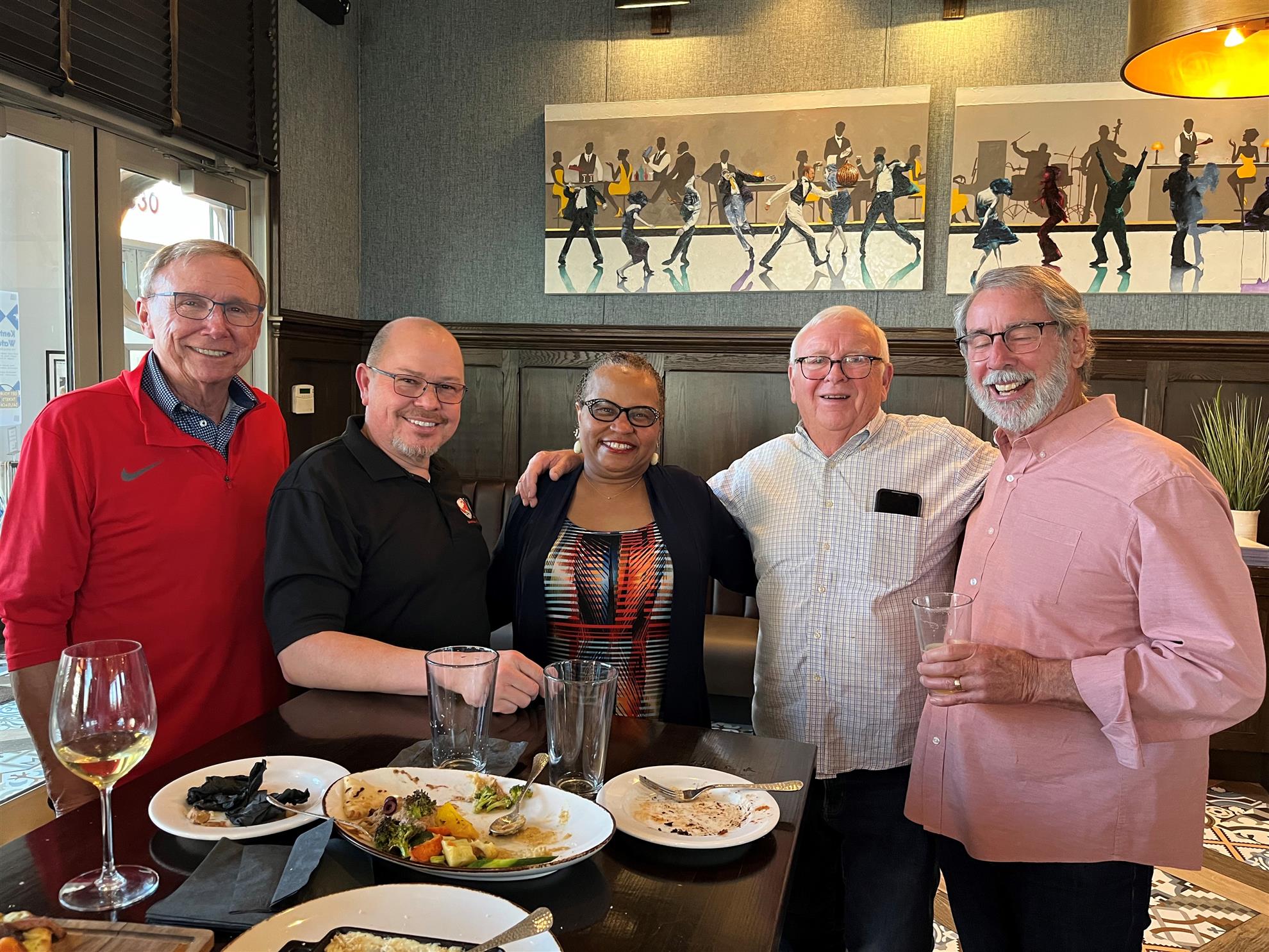 A group of approximately 35 Rotarians enjoyed mingling outside of a regular meeting at the Brass Onion at Prairie Fire.